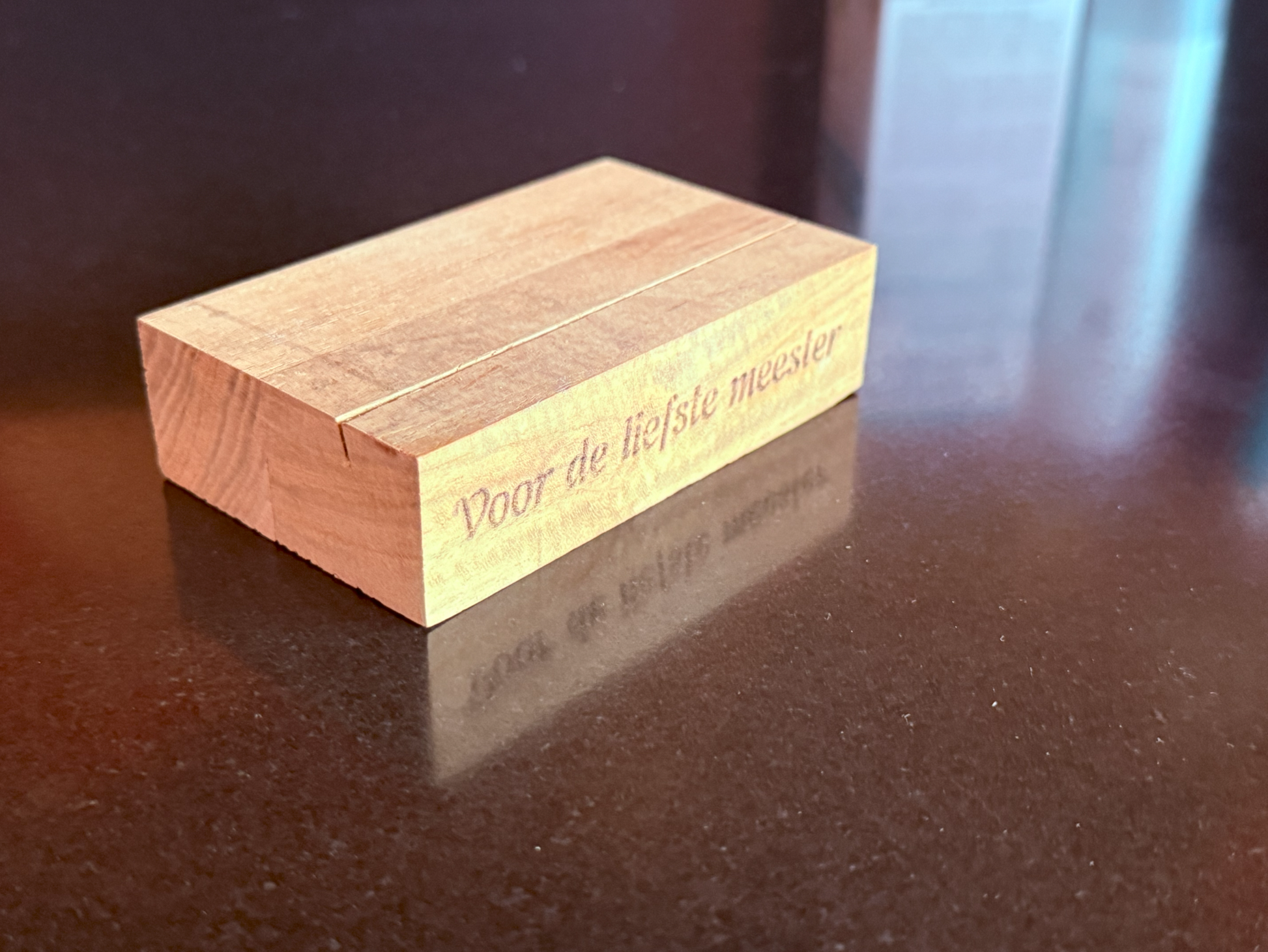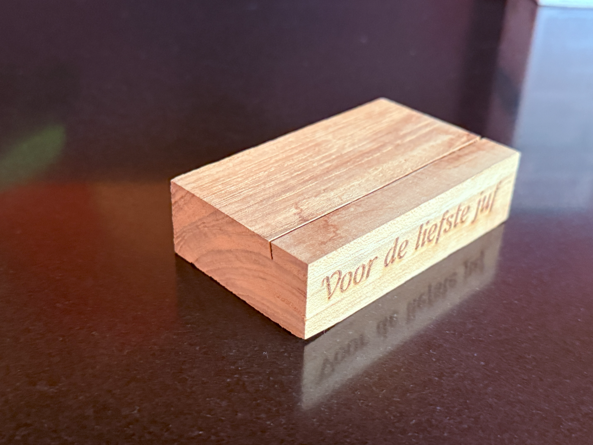Het blokje is ongeveer 10x6x2.5 cm (maten kunnen licht afwijken door het gerecupereerd karakter). Er is een sleuf voorzien van 1mm breed om de foto in te plaatsen.