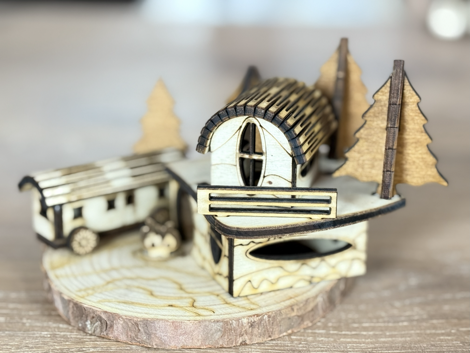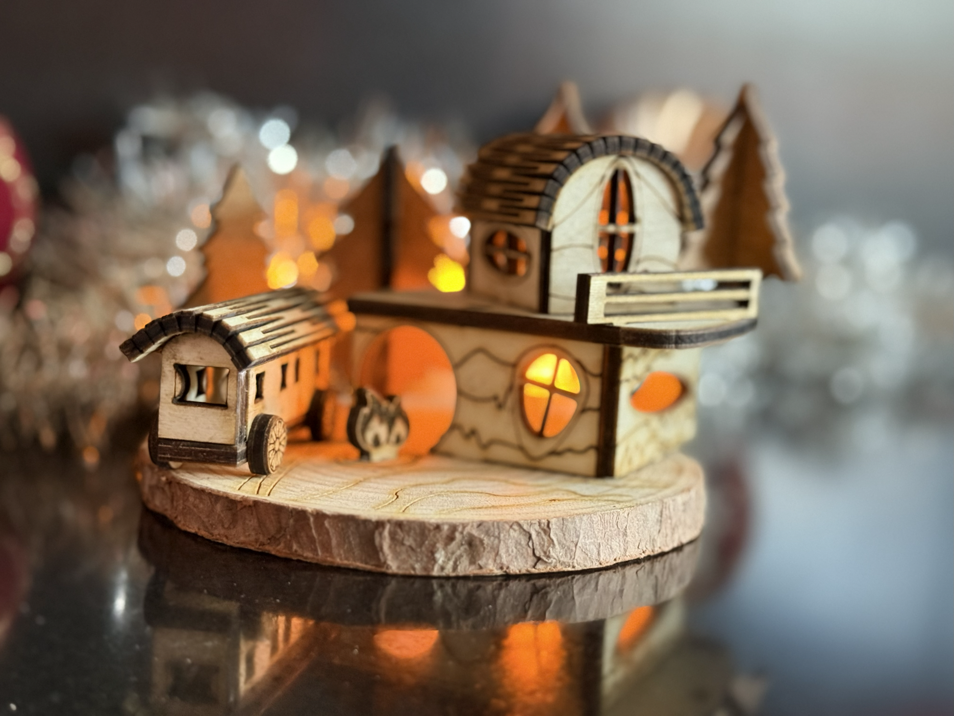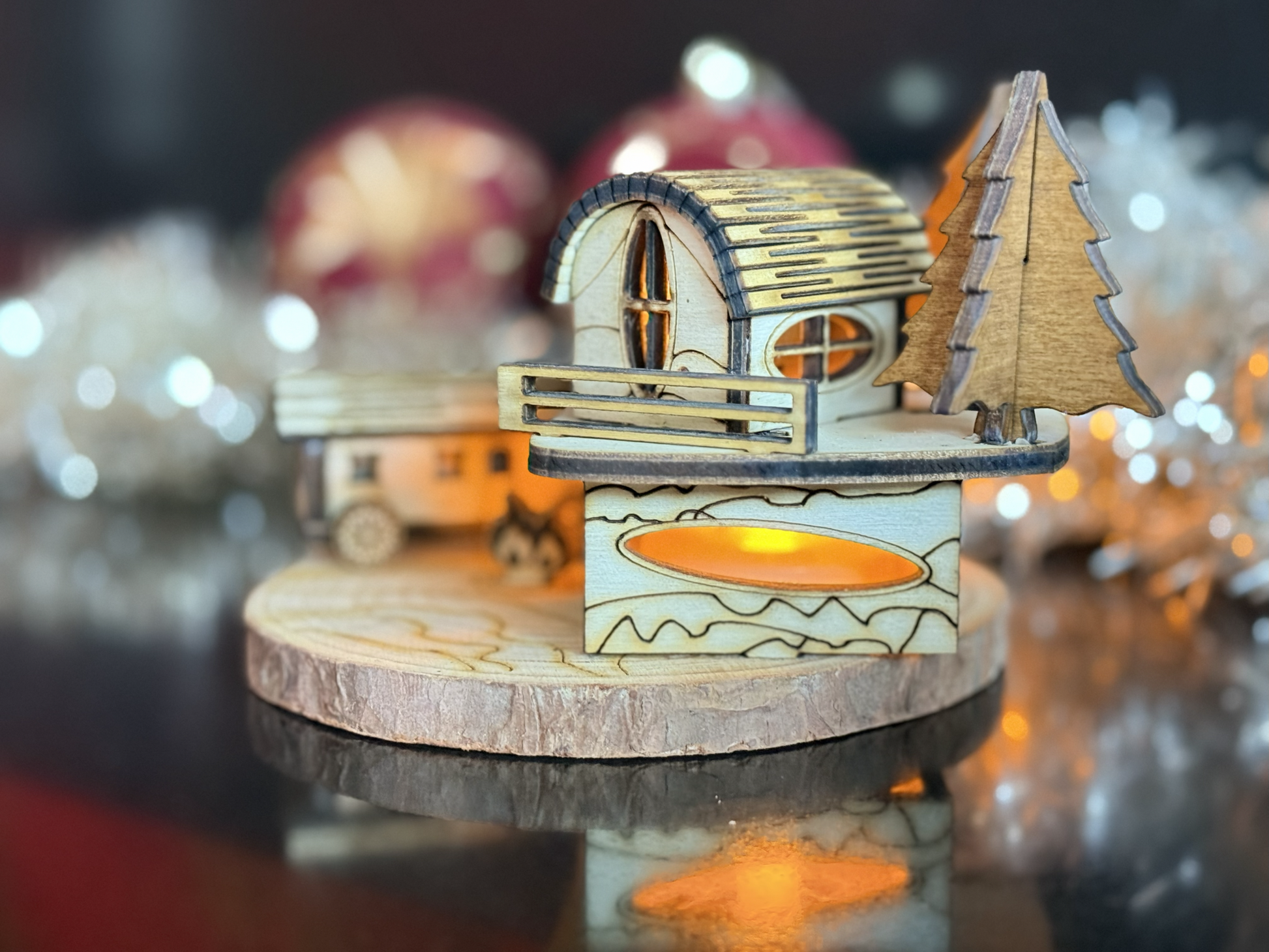 Breng de magie van kerst tot leven met dit handgemaakte houten Kerstdiorama. Het unieke ontwerp – volledig zelf ontworpen en vervaardigd – toont een sfeervol huisje in het bos met woonwagen rond een kampvuur, perfect om een warme en gezellige kerstsfeer in huis te creëren.